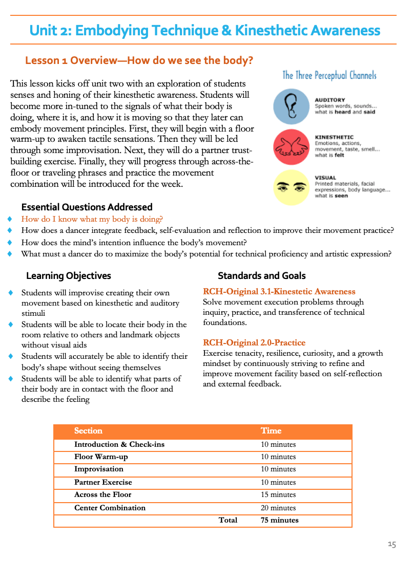 This curriculum sample is built on an earnest desire to share the liberating and transformative experience of dance education with students. It has been designed using Backward Design heuristics and founded upon the NCAAS National Core Arts Standards 9-12th grade dance standards. These standards have been revised and augmented to anchor the curriculum with more actionable aims. This curriculum represents an attempt to balance the temporal nature of dance, its tradition of oral dissemination and authoritative pedagogy, with a liberatory educational philosophy. The arts are uniquely situated at the nexus of creativity and intellect—dance particularly employs the body in the freeing of the mind.
